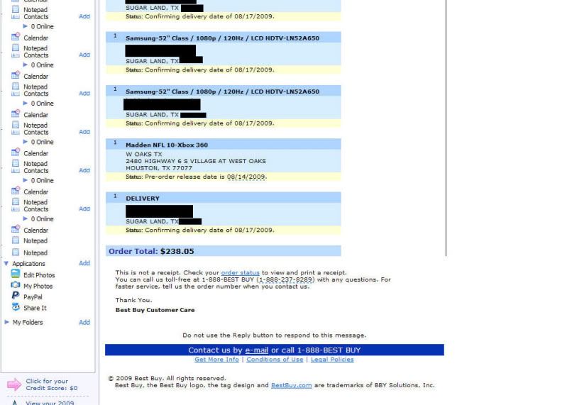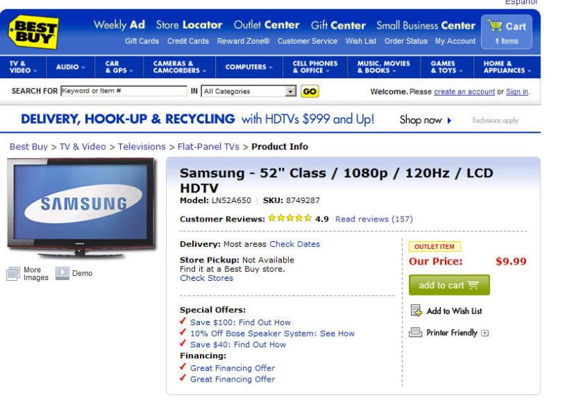 So i was on my way to work, listening to the radio and a guy called in stating that Bestbuy made a mistake and was selling a Samsung 52" for $9.99 i was like yeah right! Checked it on my iphone and it was true! My commute took like 10 seconds once i heard the news. Got to my office and Ordered 6! Lets see if Bestbuy will try to screw me outta these TV's wish me luck!